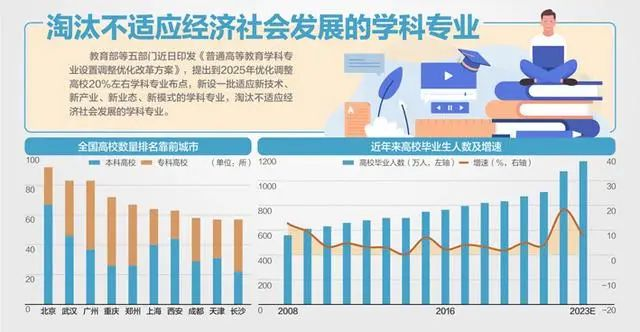此次发布的《改革方案》涉及优化调整高校学科专业、高校撤销专业条件等多方面重磅内容,引起全社会普遍关注。例如,《改革方案》指出,到2025年,优化调整高校20%左右学科专业布点,新设一批适应新技术、新产业、新业态、新模式的学科专业,淘汰不适应经济社会发展的学科专业;方案还提及,对高校连续五年未招生的专业予以撤销处理。