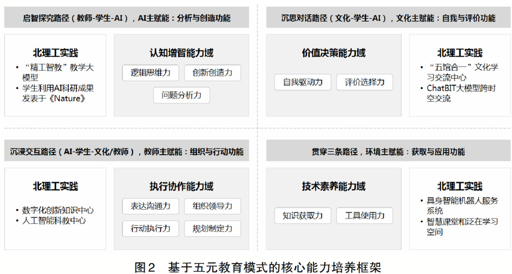 在四种基本协同关系的基础上,五元教育模式形成了三条核心的协同路径,实现了教育要素间的有机整合和动态互动。首先,启智探究路径(教师-学生-AI)以认知能力培养为核心,通过教师的启发引导激发学生的探究兴趣和问题意识,进而借助AI的智能分析和资源推荐深化学习过程。这一路径中,教师发挥“启智者”的作用,运用苏格拉底式对话、项目式学习等方法引导学生发现问题、分析问题;学生在教师启发下形成探究动机,主动运用AI工具进行深度学习和知识建构;AI则提供个性化的学习资源、智能化的分析工具和及时的反馈评价,支持学生的探究活动。其次,沉思对话路径(文化-学生-AI)以价值观塑造为重点,通过文化熏陶促进学生的价值反思,并借助AI技术实现价值教育的个性化和精准化。文化通过校园环境、课程内容、实践活动等载体潜移默化地影响学生的价值观念和行为方式,学生在文化浸润中形成价值认知和道德判断,并通过与AI的对话交流深化价值理解和自我反思,AI基于自然语言处理和情感计算技术为学生提供个性化的价值引导和道德教育支持。第三,沉浸交互路径(AI-学生-环境)以实践探究为核心,通过AI创造的沉浸式学习环境促进学生与文化、教师的深度互动。AI运用虚拟现实、增强现实等技术创建高度仿真的学习情境,为学生提供丰富的实践体验;学生在沉浸式学习中进行探索和实践,并与环境支撑和教师指导形成良性互动;这一过程中,教师给予专业指导和情感支持,共同促进学生的全面发展。