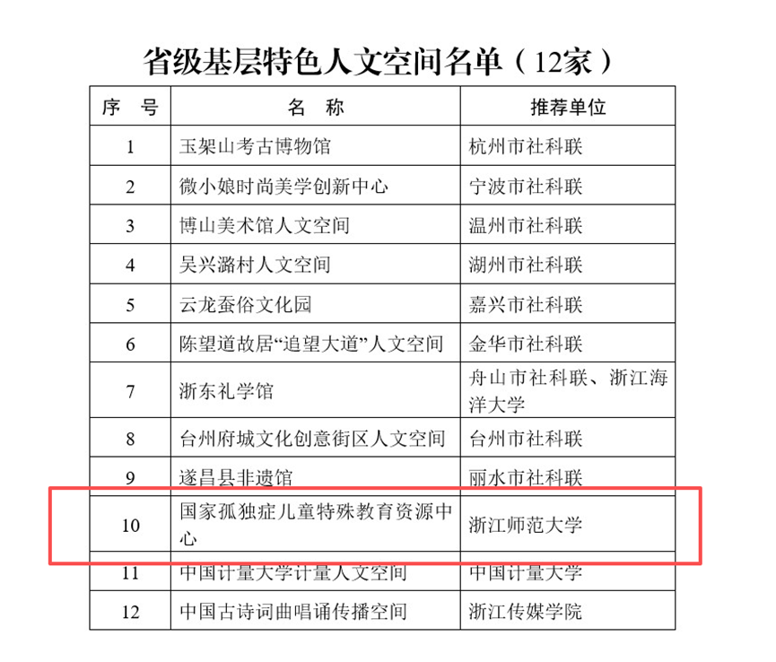 近日,浙江省社会科学界联合会公布了2025年省级基层特色人文空间名单,浙江师范大学国家孤独症儿童特殊教育资源中心成功入选,这是我校首个省级基层特色人文空间。