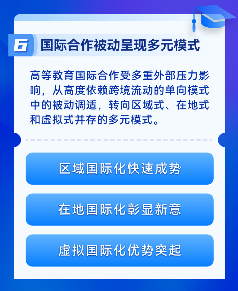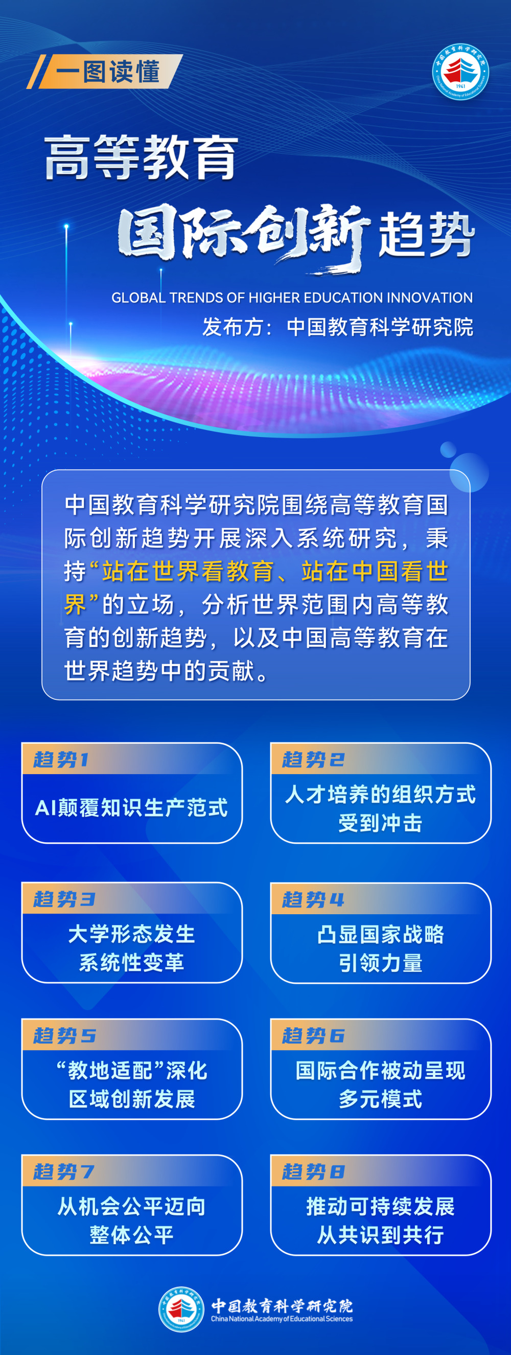 高教资讯 首页 > 高教资讯 中国教科院:高等教育国际创新八大趋势 来源:发展规划处 发布时间:2026-01-26 10 1月22日,中国教育科学研究院召开年度国际教育创新趋势研讨会,会上发布《高等教育国际创新趋势报告》,提出高等教育创新发展八大趋势。(来源:“麦克思研究”公众号 2026年1月25日)